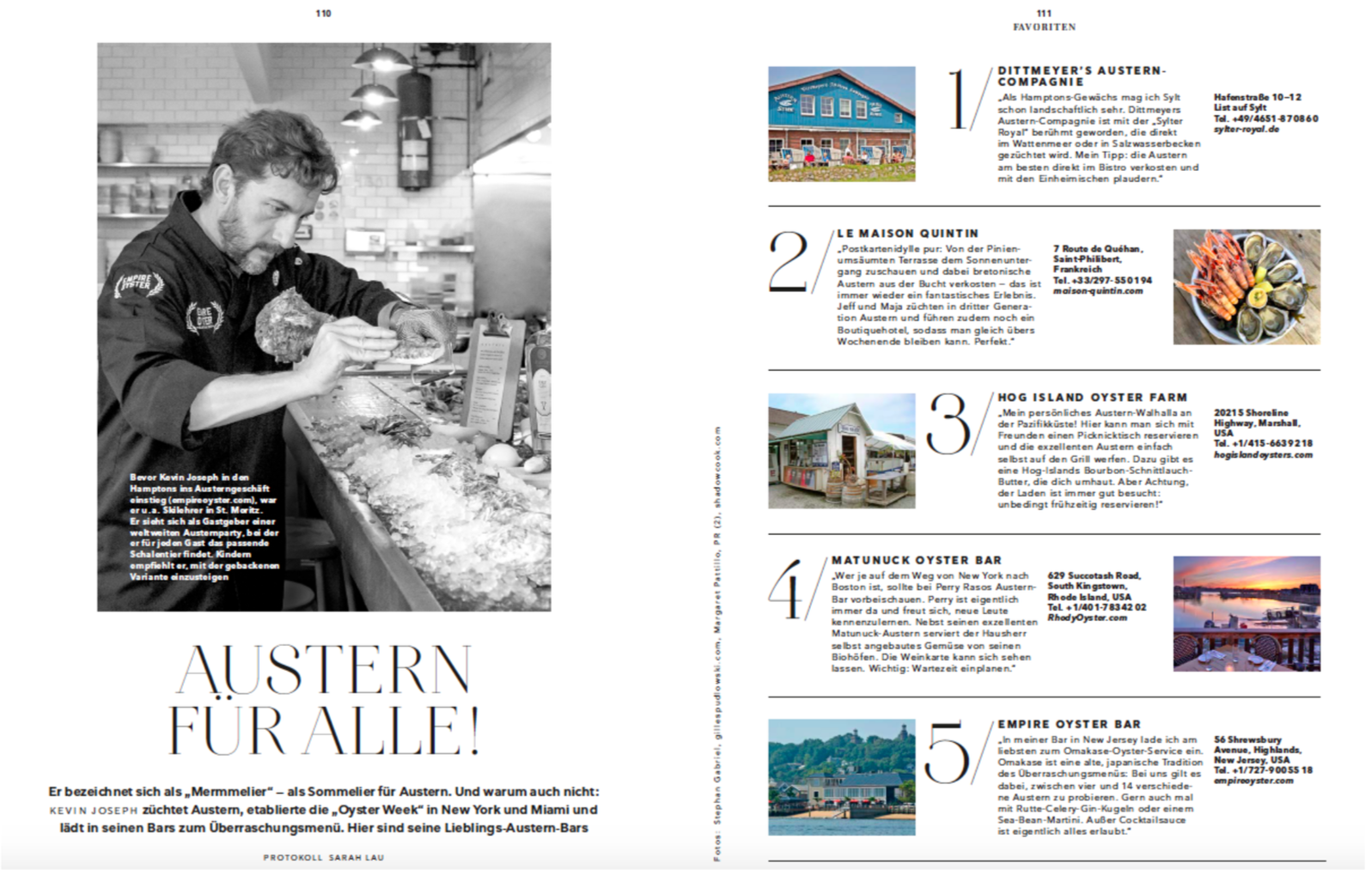 Empire Oyster Founder & CEO Kevin Joseph reveals his favorite oyster destinations on earth for this beautiful glossy magazine published in Germany.